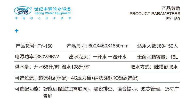 相關標簽:反滲透水處理 50人用觸摸屏直飲機、型號:FY-F150無膽速熱型
