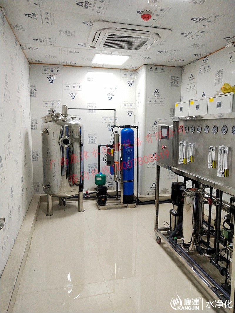工藝流程:原水-原水泵-石英砂過濾器-活性炭過濾器-反滲透設備-精密過濾器-軟化水設備-凈水箱-變頻供水回水殺菌系統-用水點