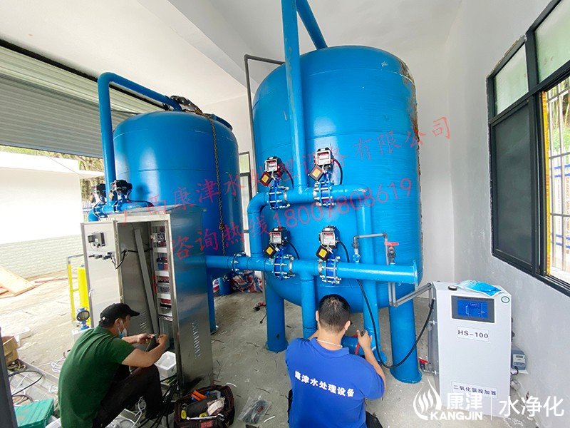 工藝流程:河水-絮凝加藥-石英砂過濾器(二級過濾)-二氧化氯消毒-凈水箱